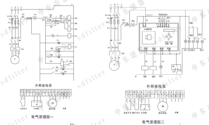 4.控制箱部分引入電源為三相四線制(380V 50HZ),驅動電機功率0.15-3kW,控制箱箱體采用防水全透屏、智能型結構,進出控制箱的接頭均為防水接頭。接線如電氣原理圖一(適用于刷式、吸吮掃描式、導流式)電氣原理圖二(適用于反沖洗)