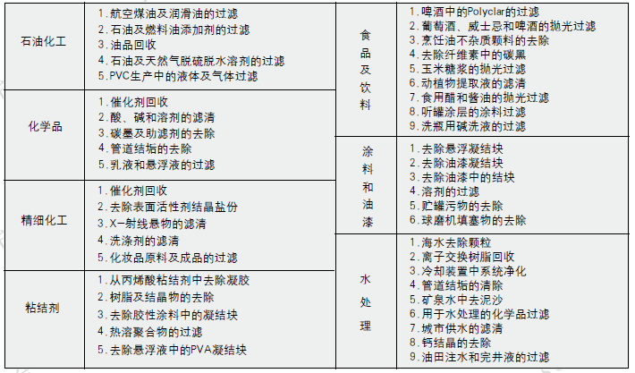 催化反應中,催化劑的去除和收集,例如:苯胺、丙烯晴、高、低密度聚乙烯,硝酸生產中空氣與氨氣的過濾。天然氣的過濾,照相用的各種化學溶液過濾,油品調合中潤滑油的過濾,溶劑類、硐類、酯類的過濾。