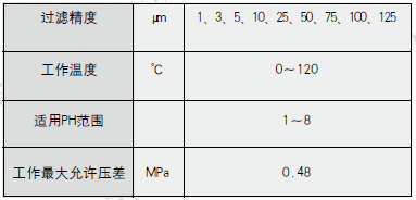 耐壓—0.5MPa 耐溫—60℃(聚丙烯骨架)、120℃(不銹鋼骨架、棉濾層)280℃(不銹鋼骨架、玻纖濾層)