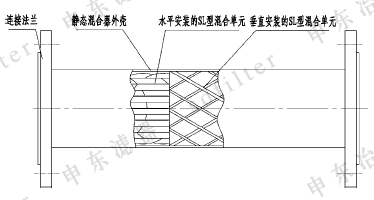 SL型靜態混合器單元由交叉的橫條按一定規律構成單X型單元,技術特性:為液-液、液-固相混合不均勻度系數αX≤5%。