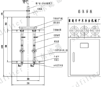 2、箱體正面板上安裝有進氣壓力表和出氣壓力表,直接監控管道壓力和使用壓力。