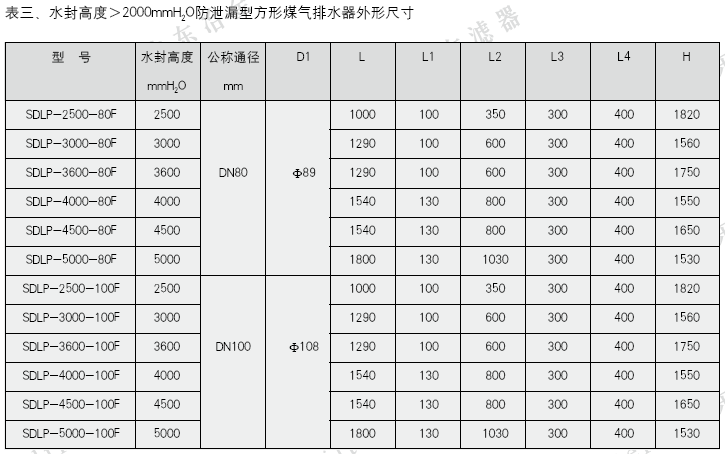 3、水封高度>2000mmH2O方形排水器外形尺寸見圖三、表三